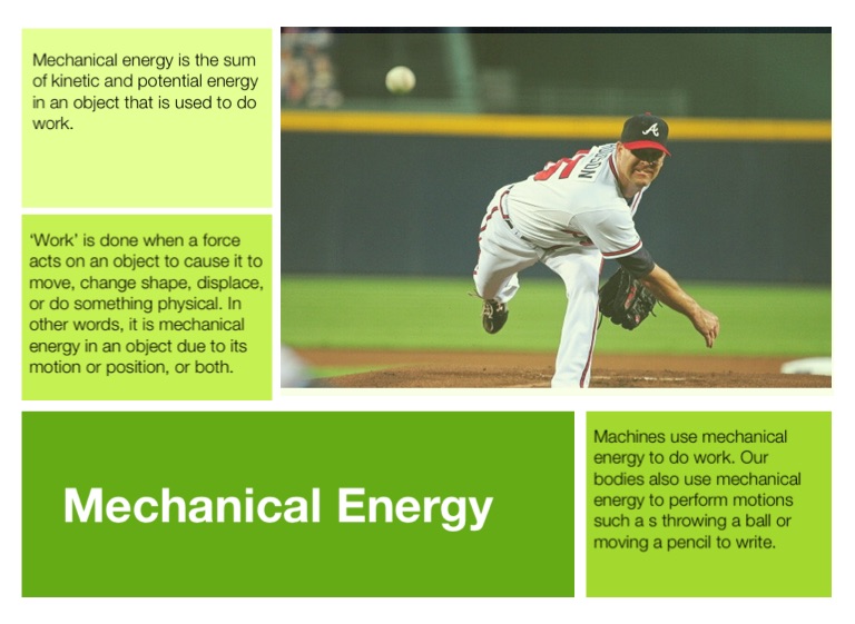 Machines use mechanical energy to do work. Our bodies also use mechanical energy to perform motions such a s throwing a ball or moving a pencil to write.