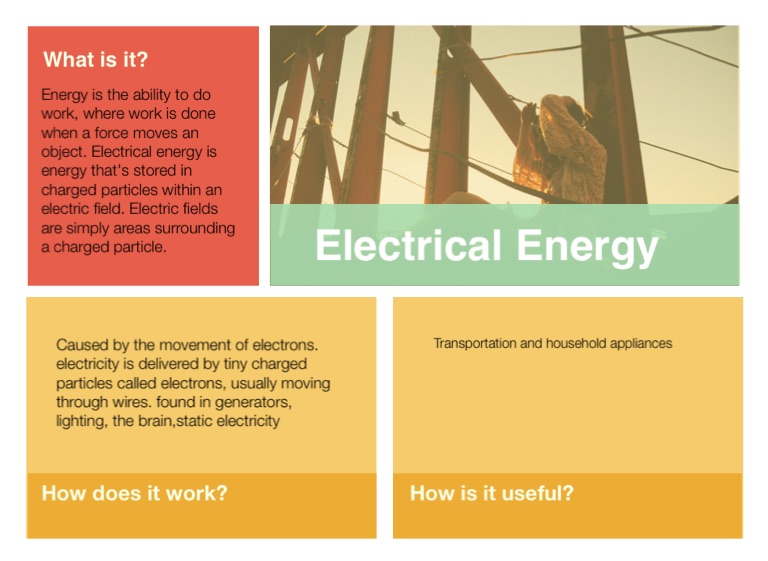 Energy is the ability to do work, where work is done when a force moves an object. Electrical energy is energy that's stored in charged particles within an electric field. Electric fields are simply areas surrounding a charged particle.