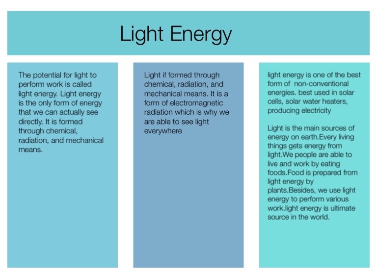 The potential for light to perform work is called light energy. Light energy is the only form of energy that we can actually see directly. It is formed through chemical, radiation, and mechanical means.