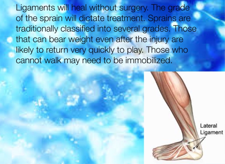 Ligaments will heal without surgery. The grade of the sprain will dictate treatment. Sprains are traditionally classified into several grades. Those that can bear weight even after the injury are likely to return very quickly to play. Those who cannot walk may need to be immobilized.