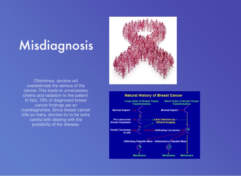 Oftentimes, doctors will overestimate the serious of the cancer. This leads to unnecessary chemo and radiation to the patient. In fact, 19% of diagnosed breast cancer findings are an overdiagnonsis. Since breast cancer kills so many, doctors try to be extra careful with dealing with the possibility of the disease.
