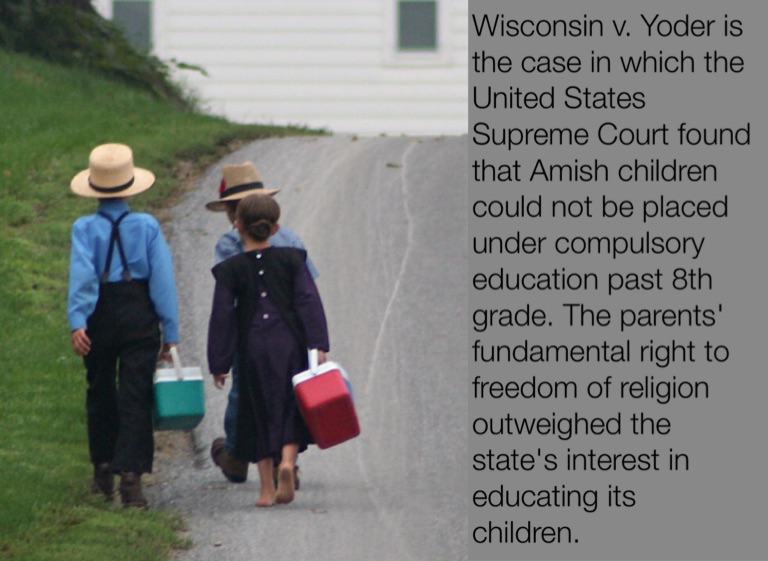 Wisconsin v. Yoder is the case in which the United States Supreme Court found that Amish children could not be placed under compulsory education past 8th grade. The parents' fundamental right to freedom of religion outweighed the state's interest in educating its children.