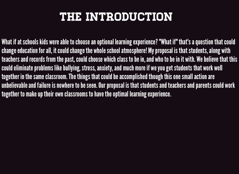 What if at schools kids were able to choose an optional learning experience? "What if" that's a question that could change education for all, it could change the whole school atmosphere! My proposal is that students, along with teachers and records from the past, could choose which class to be in, and who to be in it with. We believe that this could eliminate problems like bullying, stress, anxiety, and much more if we you get students that work well together in the same classroom. The things that could be accomplished though this one small action are unbelievable and failure is nowhere to be seen. Our proposal is that students and teachers and parents could work together to make up their own classrooms to have the optimal learning experience.