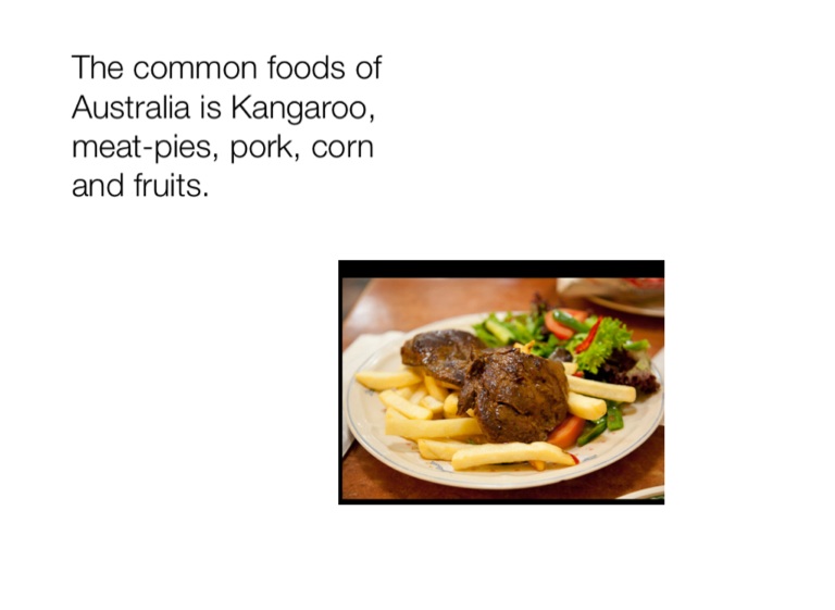 The common foods of Australia is Kangaroo, meat-pies, pork, corn and fruits.