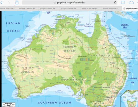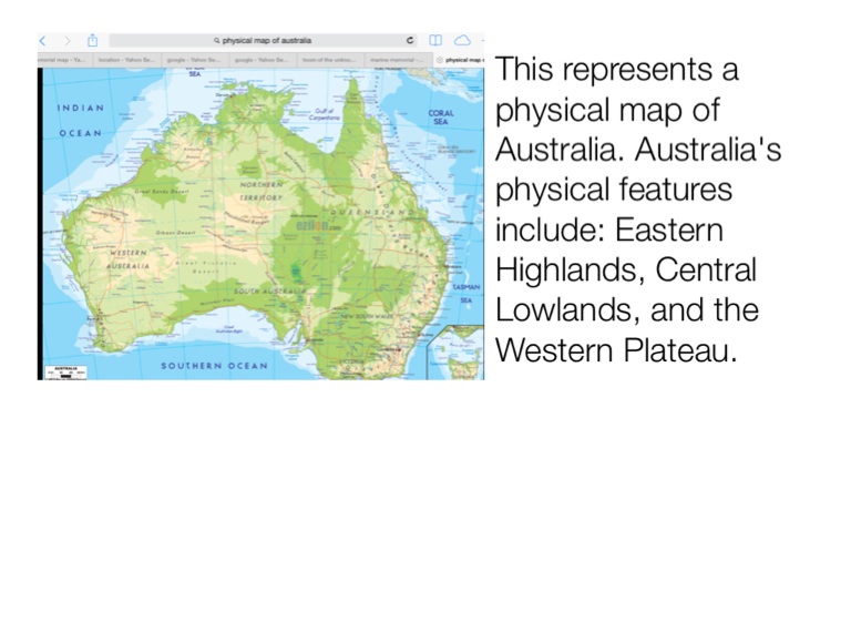This represents a physical map of Australia. Australia's physical features include: Eastern Highlands, Central Lowlands, and the Western Plateau.