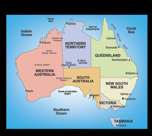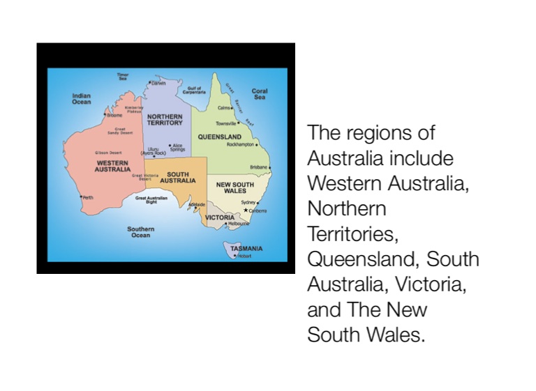 The regions of Australia include Western Australia, Northern Territories, Queensland, South Australia, Victoria, and The New South Wales.