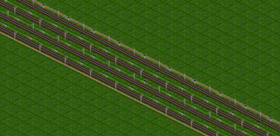 Your mainline is the backbone of your rail network. It should be fast and be able to carry tons of trains at once. In this example, we have a mainline with two tracks going NW to SE, and two going from SE to NW.