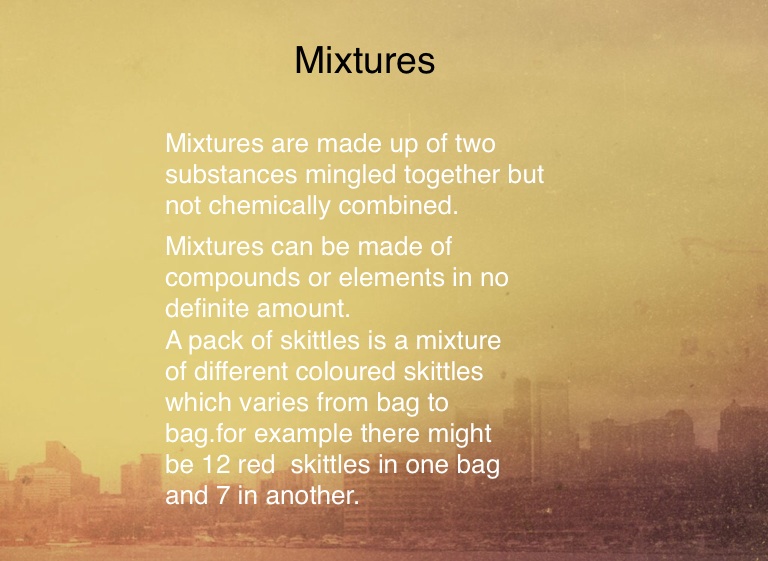 Mixtures are made up of two substances mingled together but not chemically combined.