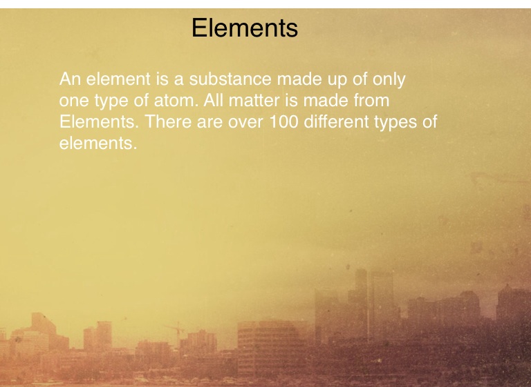 An element is a substance made up of only one type of atom. All matter is made from Elements. There are over 100 different types of elements.
