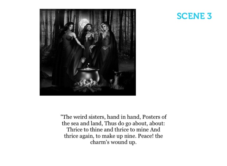 "The weird sisters, hand in hand, Posters of the sea and land, Thus do go about, about: Thrice to thine and thrice to mine And thrice again, to make up nine. Peace! the charm's wound up.