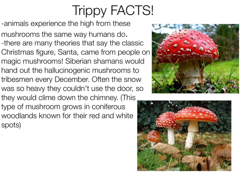 -there are many theories that say the classic Christmas figure, Santa, came from people on magic mushrooms! Siberian shamans would hand out the hallucinogenic mushrooms to tribesmen every December. Often the snow was so heavy they couldn't use the door, so they would clime down the chimney. (This type of mushroom grows in coniferous woodlands known for their red and white spots)