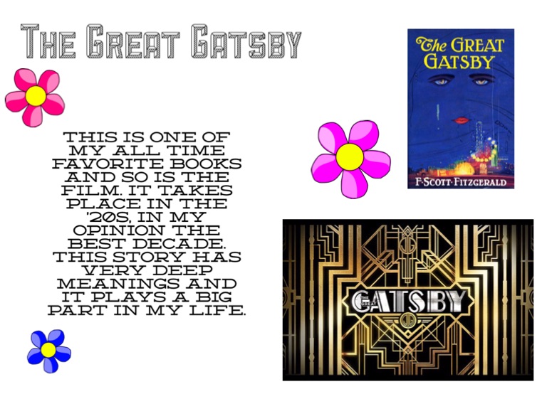 This is one of my all time favorite books and so is the film. It takes place in the '20s, in my opinion the best decade. This story has very deep meanings and it plays a big part in my life.