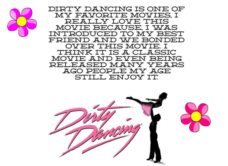 Dirty dancing is one of my favorite movies, i really love this movie because, I was introduced to my best friend and we bonded over this movie. I think it is a classic movie and even being released many years ago people my age still enjoy it.