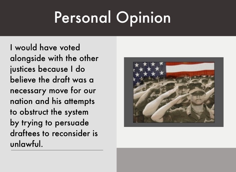 I would have voted alongside with the other justices because I do believe the draft was a necessary move for our nation and his attempts to obstruct the system by trying to persuade draftees to reconsider is unlawful.