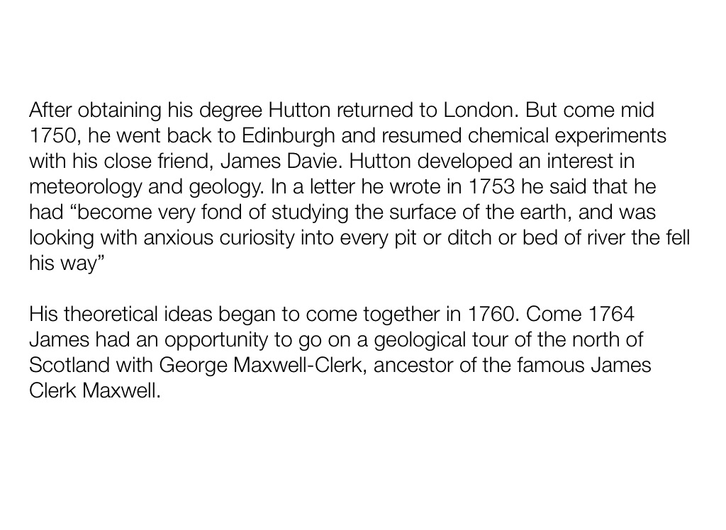 His theoretical ideas began to come together in 1760. Come 1764 James had an opportunity to go on a geological tour of the north of Scotland with George Maxwell-Clerk, ancestor of the famous James Clerk Maxwell.
