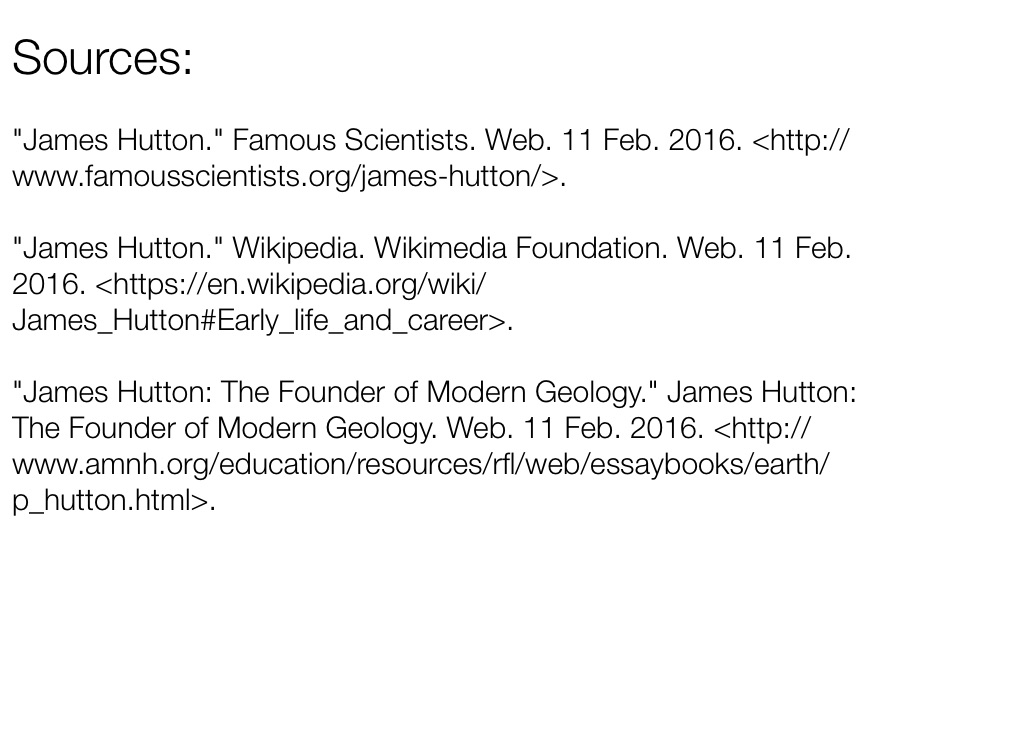 "James Hutton: The Founder of Modern Geology." James Hutton: The Founder of Modern Geology. Web. 11 Feb. 2016. <http://www.amnh.org/education/resources/rfl/web/essaybooks/earth/p_hutton.html>.