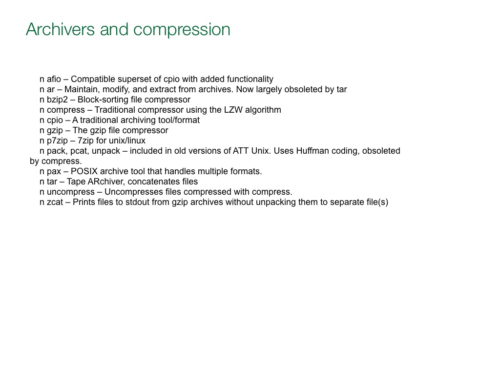 n pack, pcat, unpack – included in old versions of ATT Unix. Uses Huffman coding, obsoleted by compress.