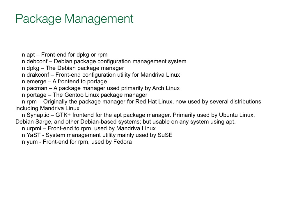 n rpm – Originally the package manager for Red Hat Linux, now used by several distributions including Mandriva Linux