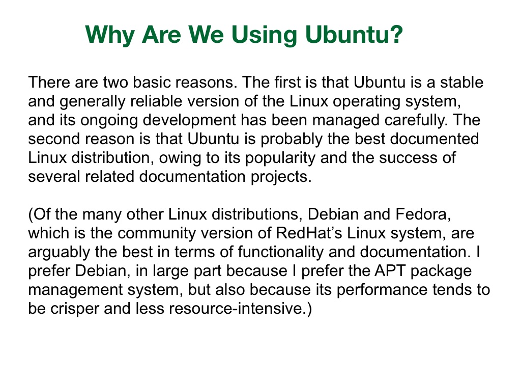 (Of the many other Linux distributions, Debian and Fedora, which is the community version of RedHat’s Linux system, are arguably the best in terms of functionality and documentation. I prefer Debian, in large part because I prefer the APT package management system, but also because its performance tends to be crisper and less resource-intensive.)