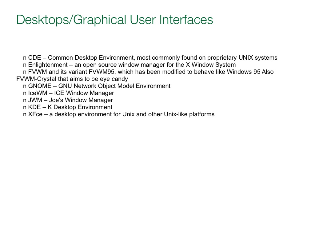 n CDE – Common Desktop Environment, most commonly found on proprietary UNIX systems