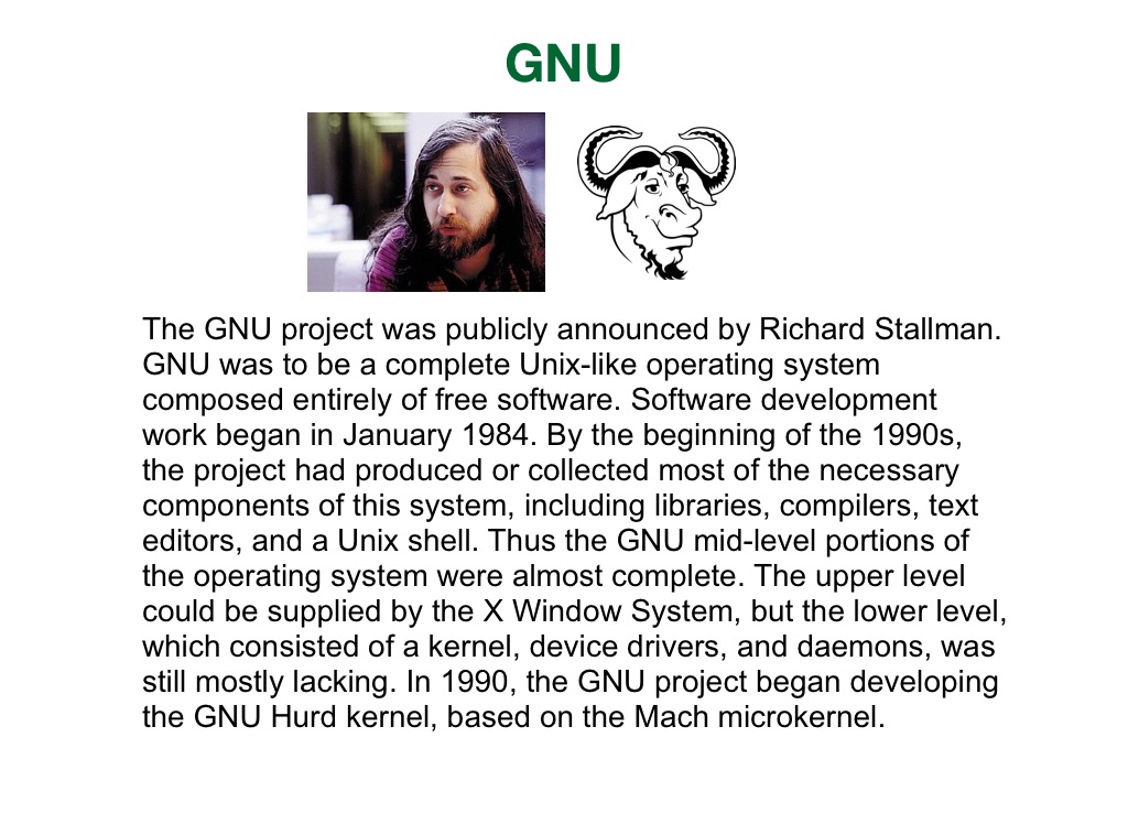 The GNU project was publicly announced by Richard Stallman. GNU was to be a complete Unix-like operating system composed entirely of free software. Software development work began in January 1984. By the beginning of the 1990s, the project had produced or collected most of the necessary components of this system, including libraries, compilers, text editors, and a Unix shell. Thus the GNU mid-level portions of the operating system were almost complete. The upper level could be supplied by the X Window System, but the lower level, which consisted of a kernel, device drivers, and daemons, was still mostly lacking. In 1990, the GNU project began developing the GNU Hurd kernel, based on the Mach microkernel.