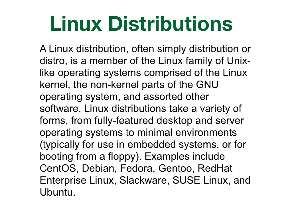 A Linux distribution, often simply distribution or distro, is a member of the Linux family of Unix-like operating systems comprised of the Linux kernel, the non-kernel parts of the GNU operating system, and assorted other software. Linux distributions take a variety of forms, from fully-featured desktop and server operating systems to minimal environments (typically for use in embedded systems, or for booting from a floppy). Examples include CentOS, Debian, Fedora, Gentoo, RedHat Enterprise Linux, Slackware, SUSE Linux, and Ubuntu.