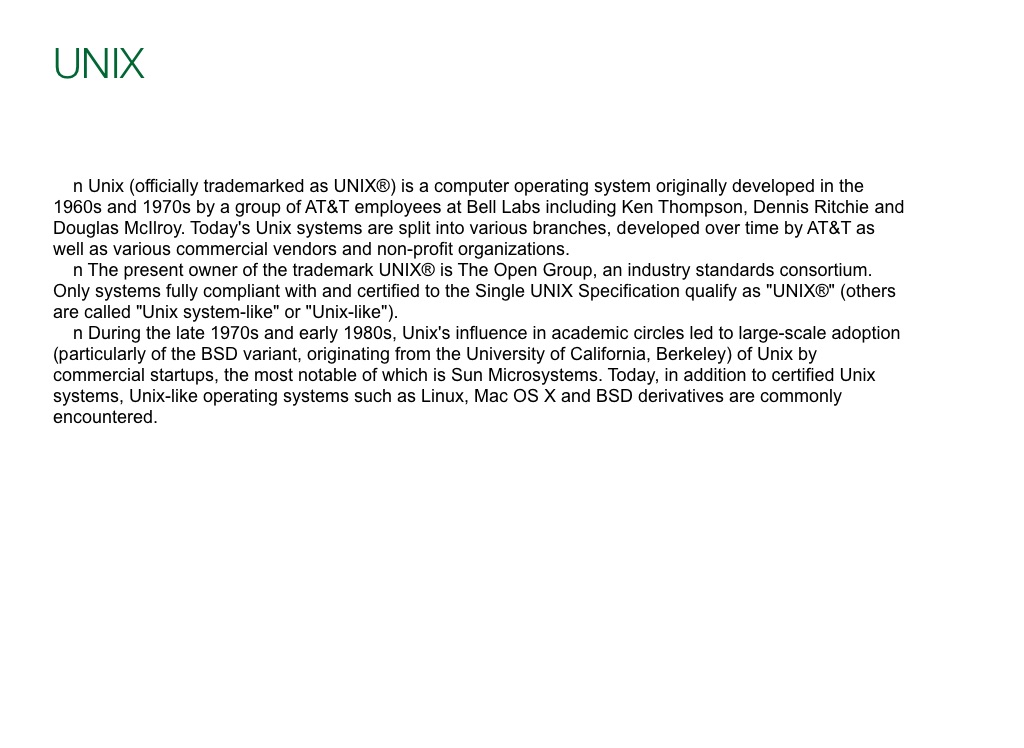 n Unix (officially trademarked as UNIX®) is a computer operating system originally developed in the 1960s and 1970s by a group of AT&T employees at Bell Labs including Ken Thompson, Dennis Ritchie and Douglas McIlroy. Today's Unix systems are split into various branches, developed over time by AT&T as well as various commercial vendors and non-profit organizations.