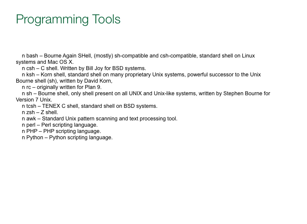 n bash – Bourne Again SHell, (mostly) sh-compatible and csh-compatible, standard shell on Linux systems and Mac OS X.