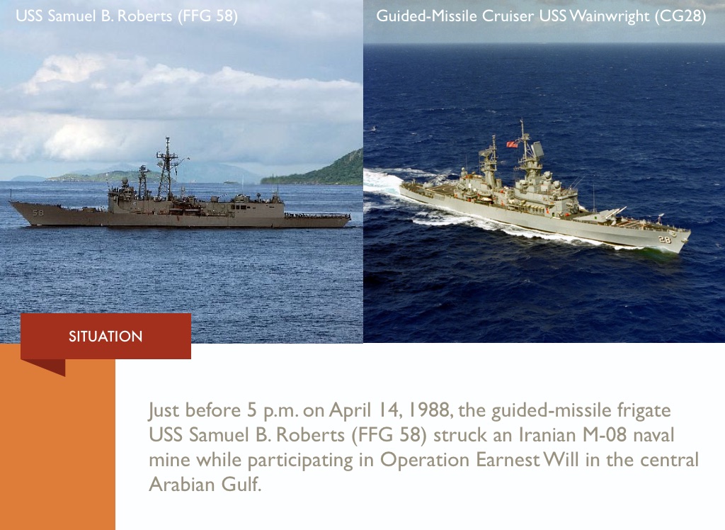 Just before 5 p.m. on April 14, 1988, the guided-missile frigate USS Samuel B. Roberts (FFG 58) struck an Iranian M-08 naval mine while participating in Operation Earnest Will in the central Arabian Gulf.