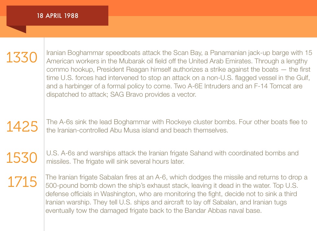 Iranian Boghammar speedboats attack the Scan Bay, a Panamanian jack-up barge with 15 American workers in the Mubarak oil field off the United Arab Emirates. Through a lengthy commo hookup, President Reagan himself authorizes a strike against the boats — the first time U.S. forces had intervened to stop an attack on a non-U.S. flagged vessel in the Gulf, and a harbinger of a formal policy to come. Two A-6E Intruders and an F-14 Tomcat are dispatched to attack; SAG Bravo provides a vector.