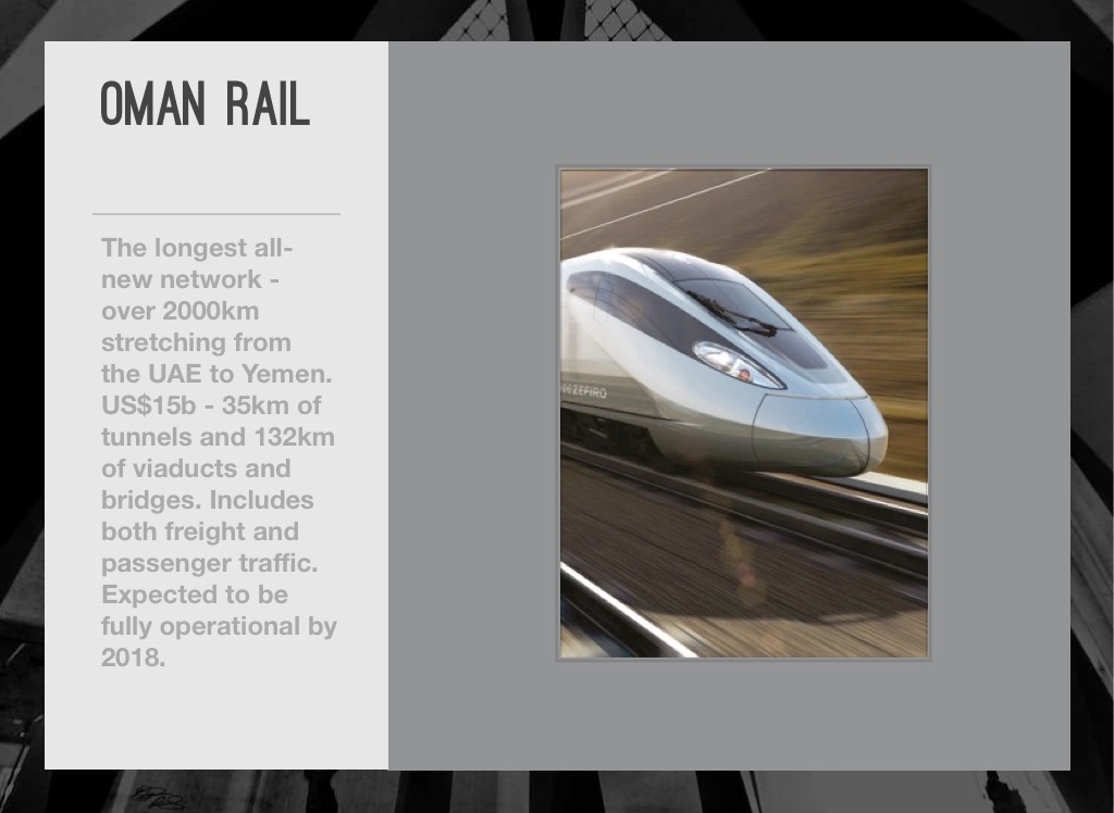 The longest all-new network - over 2000km stretching from the UAE to Yemen. US$15b - 35km of tunnels and 132km of viaducts and bridges. Includes both freight and passenger traffic. Expected to be fully operational by 2018.
