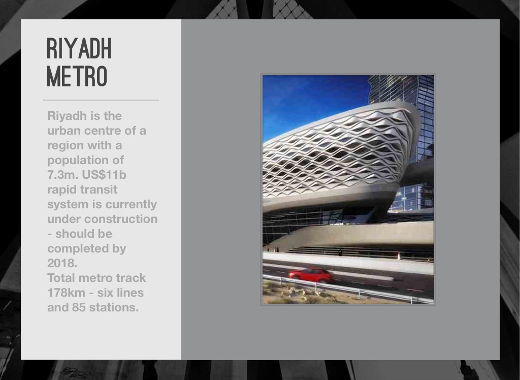Riyadh is the urban centre of a region with a population of 7.3m. US$11b rapid transit system is currently under construction - should be completed by 2018.