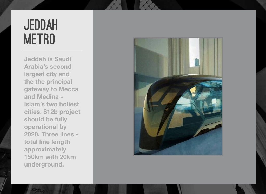Jeddah is Saudi Arabia’s second largest city and the the principal gateway to Mecca and Medina - Islam’s two holiest cities. $12b project should be fully operational by 2020. Three lines - total line length approximately 150km with 20km underground.