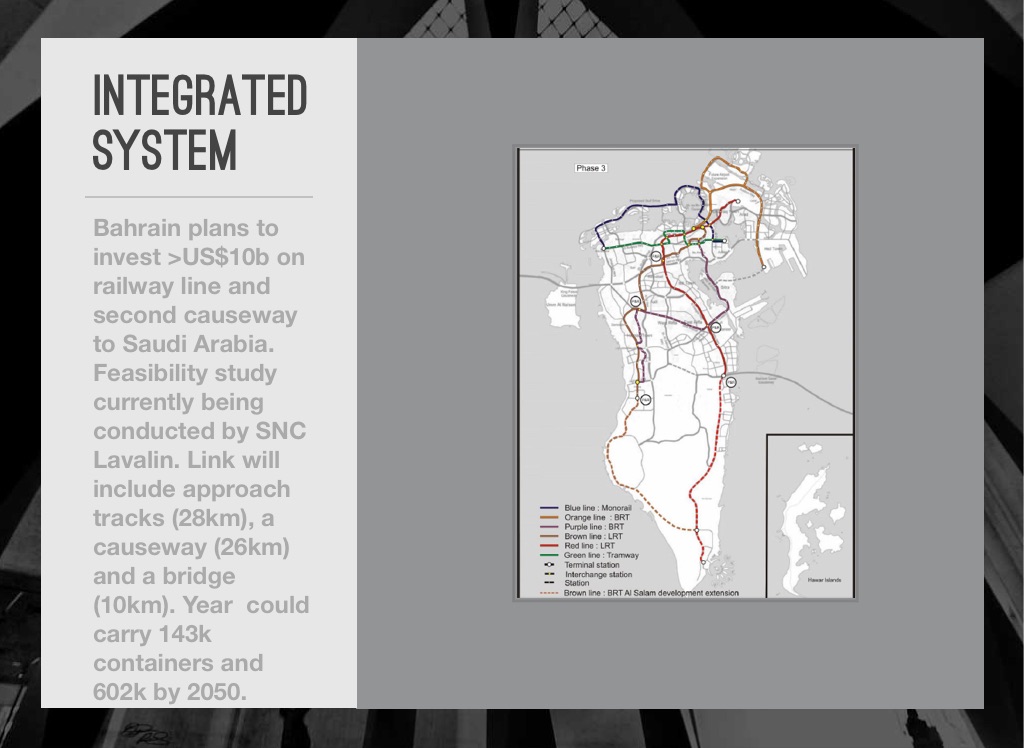 Bahrain plans to invest >US$10b on railway line and second causeway to Saudi Arabia.