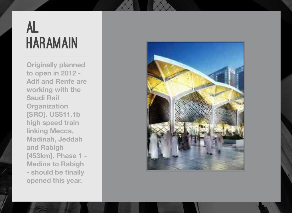 Originally planned to open in 2012 - Adif and Renfe are working with the Saudi Rail Organization [SRO]. US$11.1b high speed train linking Mecca, Madinah, Jeddah and Rabigh [453km]. Phase 1 - Medina to Rabigh - should be finally opened this year.