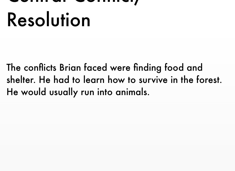 The conflicts Brian faced were finding food and shelter. He had to learn how to survive in the forest. He would usually run into animals.