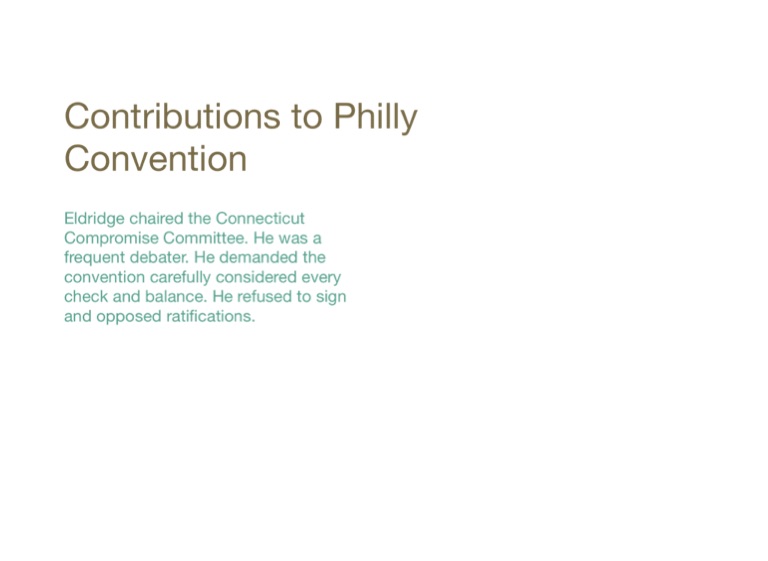 Eldridge chaired the Connecticut Compromise Committee. He was a frequent debater. He demanded the convention carefully considered every check and balance. He refused to sign and opposed ratifications.