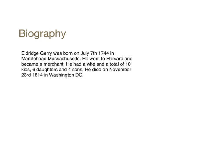 Eldridge Gerry was born on July 7th 1744 in Marblehead Massachusetts. He went to Harvard and became a merchant. He had a wife and a total of 10 kids, 6 daughters and 4 sons. He died on November 23rd 1814 in Washington DC.