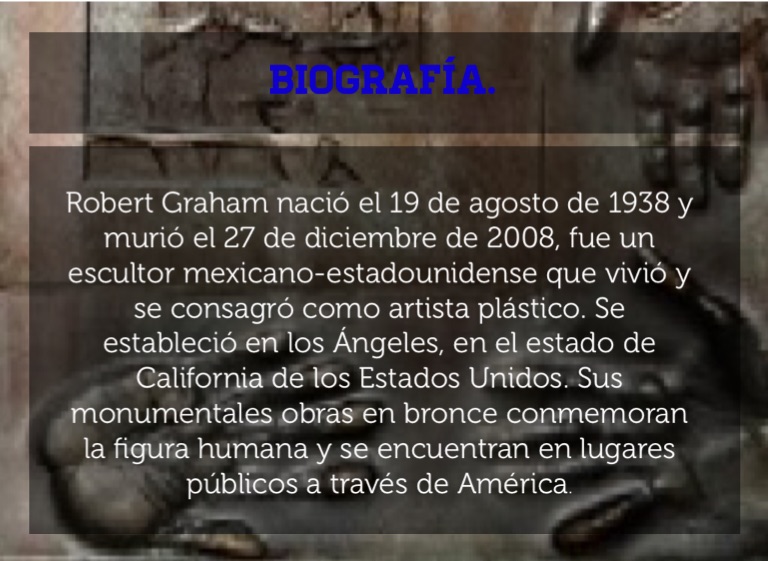 Robert Graham nació el 19 de agosto de 1938 y murió el 27 de diciembre de 2008, fue un escultor mexicano-estadounidense que vivió y se consagró como artista plástico. Se estableció en los Ángeles, en el estado de California de los Estados Unidos. Sus monumentales obras en bronce conmemoran la figura humana y se encuentran en lugares públicos a través de América.