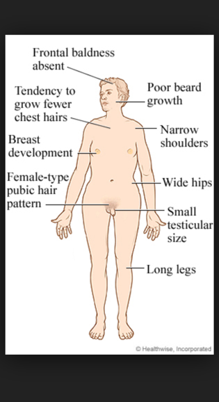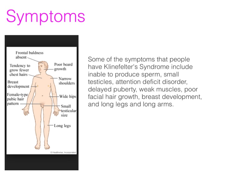 Some of the symptoms that people have Klinefelter's Syndrome include inable to produce sperm, small testicles, attention deficit disorder, delayed puberty, weak muscles, poor facial hair growth, breast development, and long legs and long arms.
