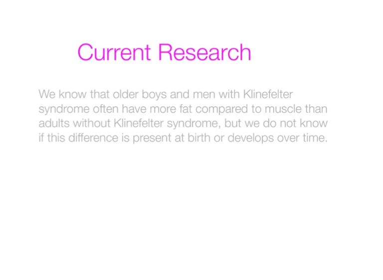 We know that older boys and men with Klinefelter syndrome often have more fat compared to muscle than adults without Klinefelter syndrome, but we do not know if this difference is present at birth or develops over time.