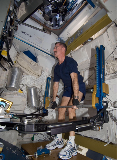 Resistance Exercise Device (RED): The RED looks like weight-lifting machines you may see on television. To use it, astronauts pull and twist stretchy rubber-band-like cords attached to pulleys. The RED can be used for a total body workout. From squats and bending exercises for the legs, to arm exercises and heel raises, astronauts can do them all on the RED.