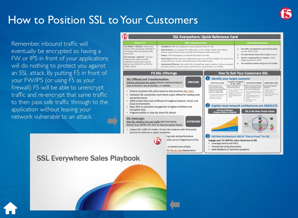 Remember, inbound traffic will eventually be encrypted so having a FW or IPS in front of your applications will do nothing to protect you against an SSL attack. By putting F5 in front of your FW/IPS (or using F5 as your firewall) F5 will be able to unencrypt traffic and re-encrypt that same traffic to then pass safe traffic through to the application without leaving your network vulnerable to an attack.