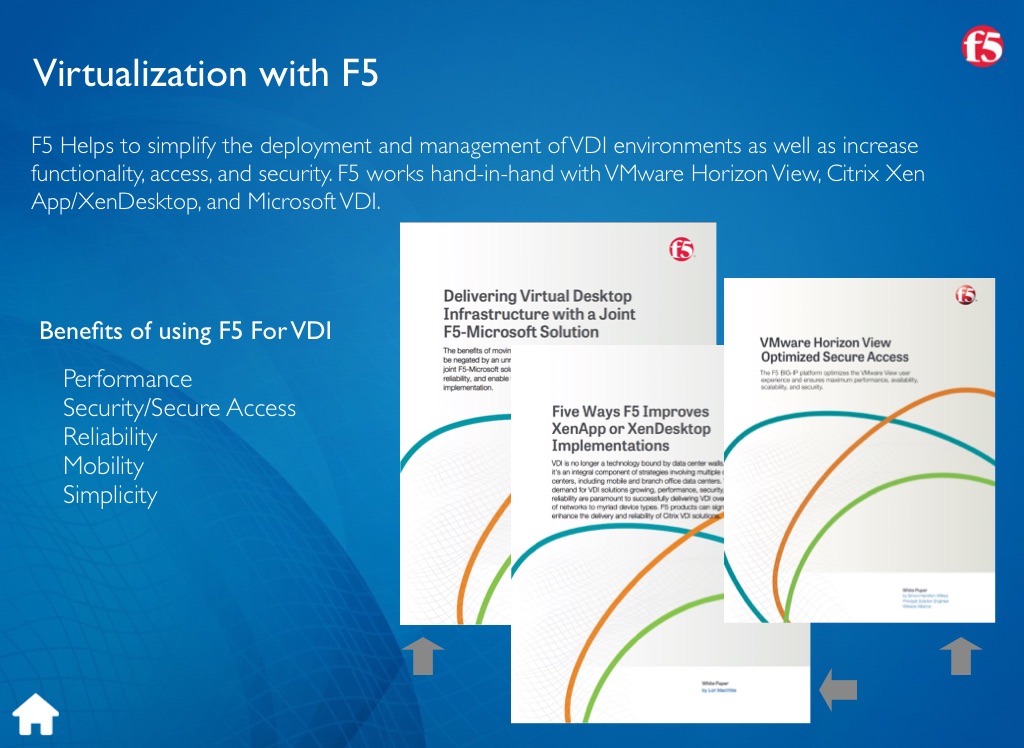 F5 Helps to simplify the deployment and management of VDI environments as well as increase functionality, access, and security. F5 works hand-in-hand with VMware Horizon View, Citrix Xen App/XenDesktop, and Microsoft VDI.