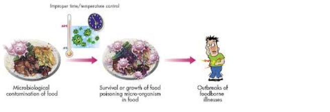 Biological Contamination occurs when food is left out in the danger zone of 5-60 degrees. The three things bacteria needs in time heat and moisture. An example of biological contamination in the kitchen would be if someone used the same chopping border to cut vegetables and meat.
