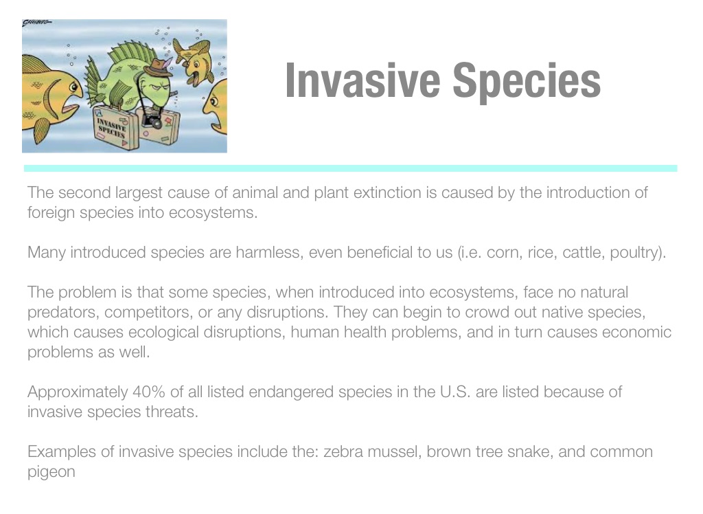 Examples of invasive species include the: zebra mussel, brown tree snake, and common pigeon