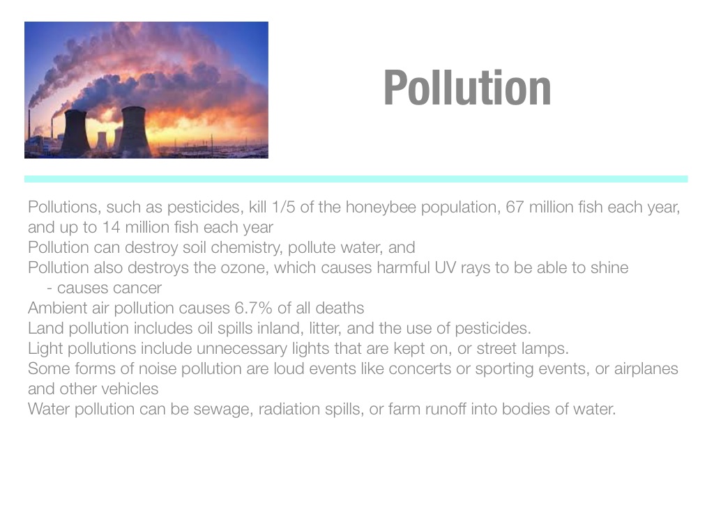Pollutions, such as pesticides, kill 1/5 of the honeybee population, 67 million fish each year, and up to 14 million fish each year