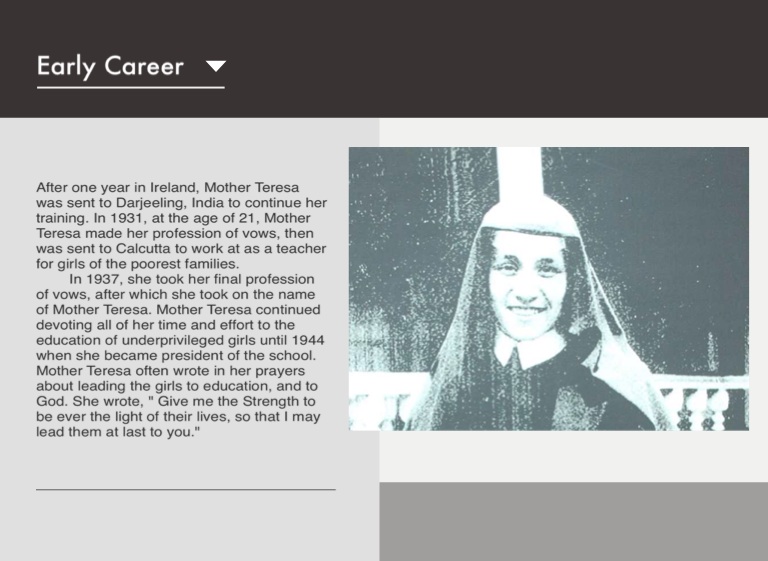 After one year in Ireland, Mother Teresa was sent to Darjeeling, India to continue her training. In 1931, at the age of 21, Mother Teresa made her profession of vows, then was sent to Calcutta to work at as a teacher for girls of the poorest families.