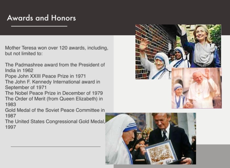 Mother Teresa won over 120 awards, including, but not limited to: