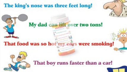 An exaggerated Statement used to heighten effect. It is not to mislead the reader, but to emphasize a point.